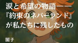 アニメ涙と希望の物語──『約束のネバーランド』が私たちに残したもの ※上記のアイキャッチ画像はイメージですやっほ〜、園子だよ🌸今回は、私が本気で「これは語らずにはいられない!」って思ったアニメ『約束のネバーランド』をテーマに、思いっきり深堀りしてみるね。1. “楽園”の正体に気づいたとき最初に描かれるグレイ... 2025.10.01アニメ少年マンガ